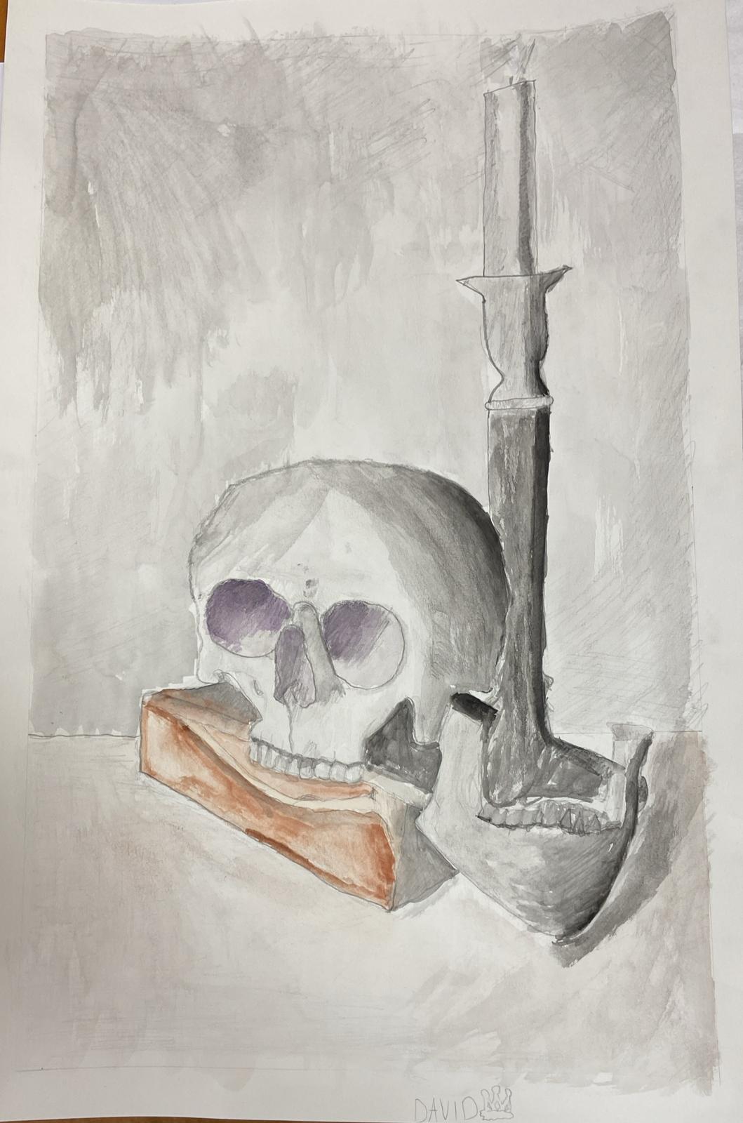 Wat u hier ziet is een tekening dat ik heb gemaakt op de middelbare school als keuzedeel vak. De thema was vanitas dus ik heb natuurlijk een schedel getekent met een kandelaar en boek donkere kleuren.